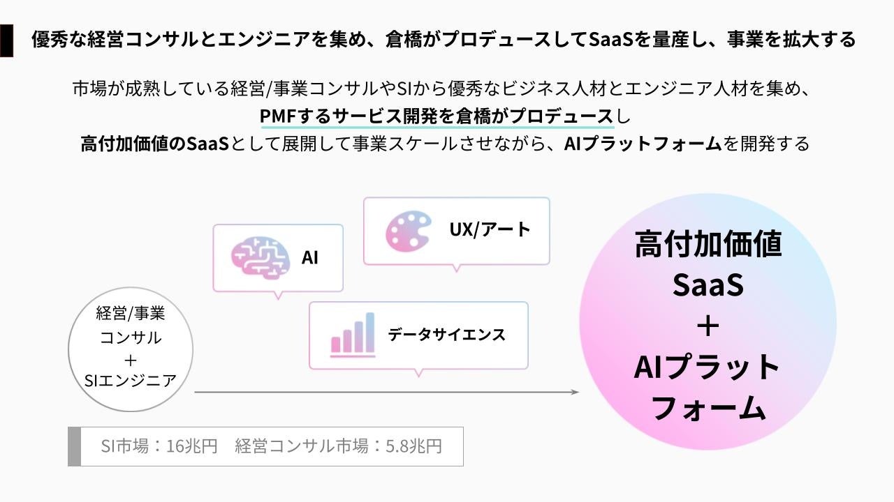 AIにデータサイエンスをかけ合わせることで、AIだけを活用した場合に比べて数十倍の経営利益を創出した実績を持つ当社代表・倉橋プロデュースのもと、優秀な経営・事業コンサルタントとエンジニアがタッグを組み、まだ世の中にない高付加価値なSaaSの量産とAIプラットフォームの開発を目指します。