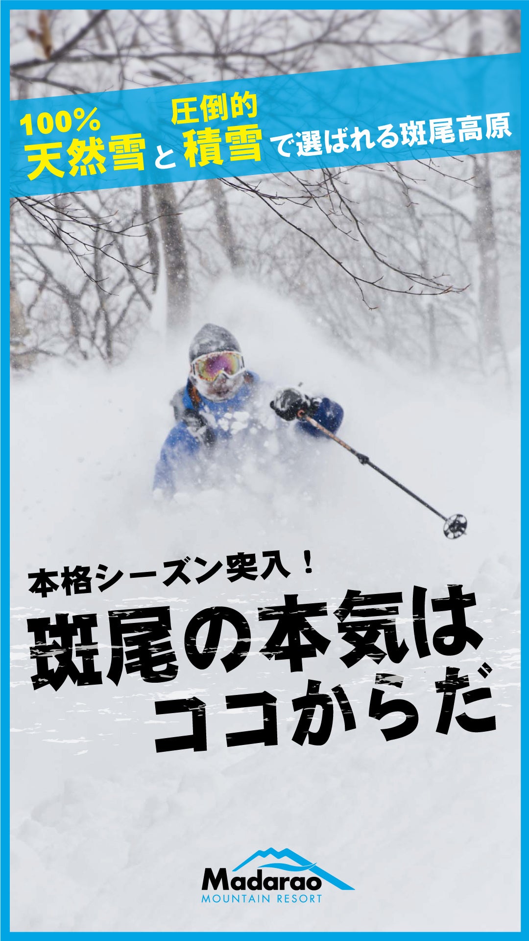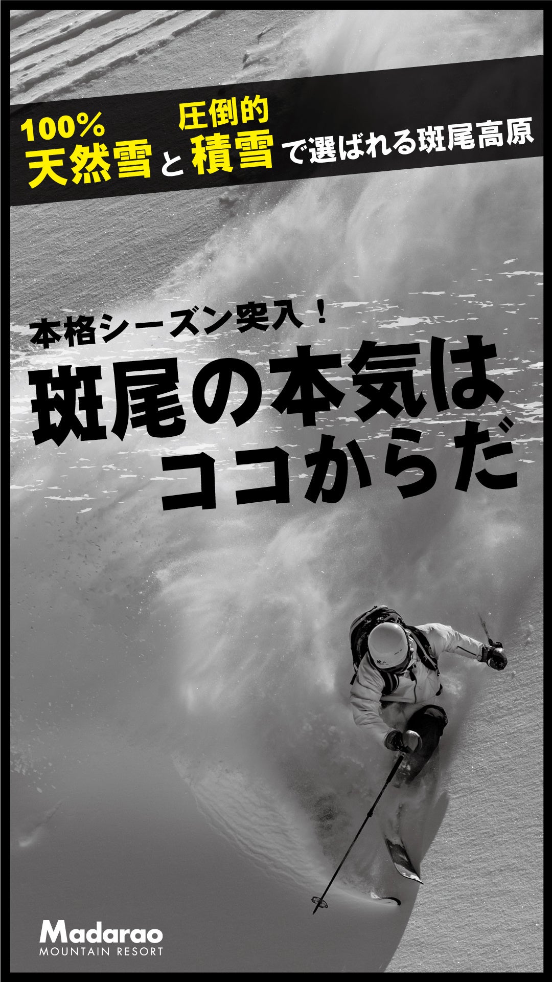 斑尾⾼原スキー場は、関東圏から2時間、飯⼭駅から30分アクセスに位置にあります。当スキー場は、 「MadaPOW」と呼ばれる上質なディープパウダースノーと⽇本最⼤級のツリーランコース(11コース)を提供するスキー場として国内外で知られており、上質なパウダースノーを求める多くのスキーヤー、スノーボーダーに人気のスキー場です。