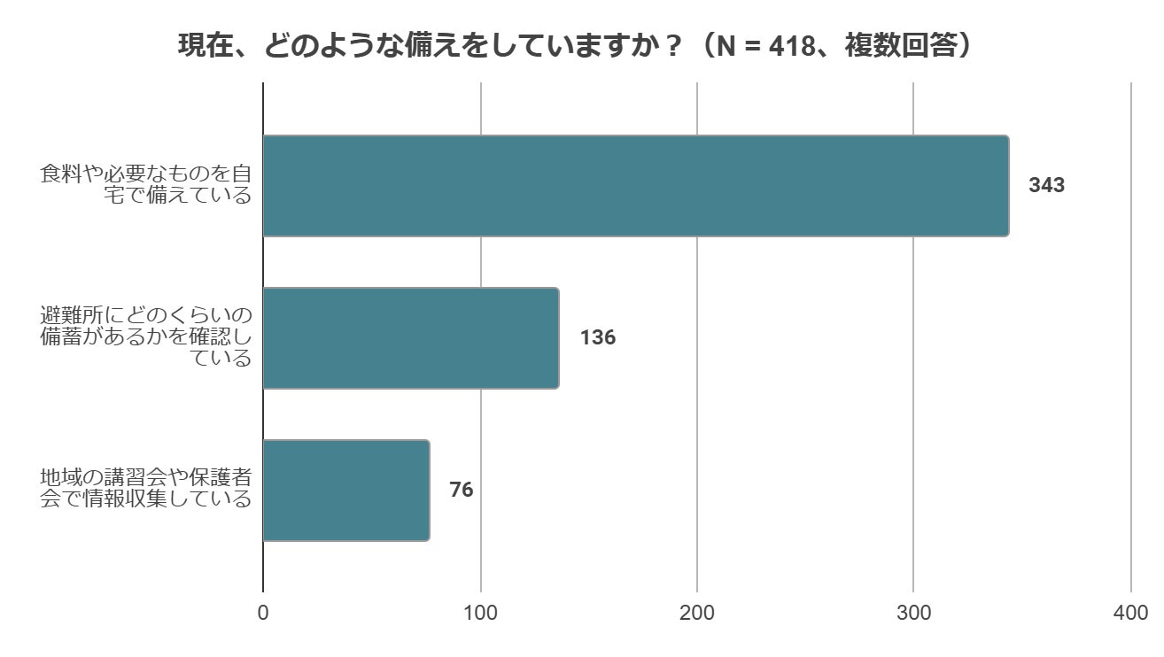 子どもができる前、もしくは子どもがいる現在で「災害のための備えをしている」と回答した方を対象に「どのような備えをしていますか?(していましたか?)」という複数回答可のアンケートを行ったところ、下記グラフのような結果となりました。