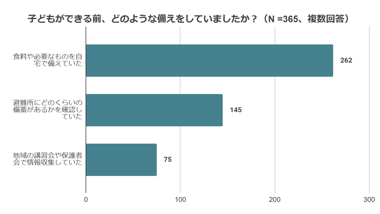 ちなみに「現在まだ備えをしていないが意識も行動も変わった」と回答した12人(3.73%)については、子どもをきっかけに意識や行動に変化はあったものの、現状十分な防災には至っていないのだと読み取れます。