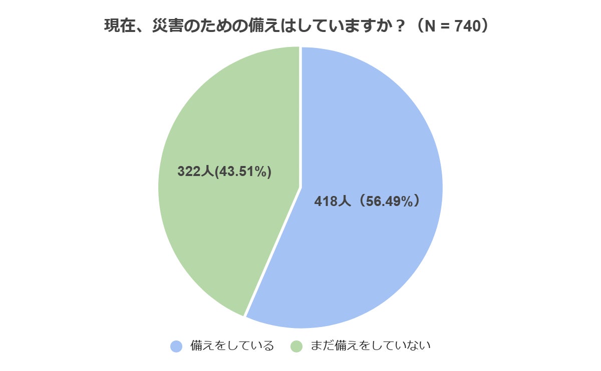 0歳から2歳の子どもがいる家庭の父母740名を対象に「災害のための備えをしていますか?」というアンケートをとったところ、子どもができる前は365人(49.32%)が「備えをしていた」と回答したのに対し、子どもがいる現在は418人(56.49%)が「備えをしている」と回答しました。