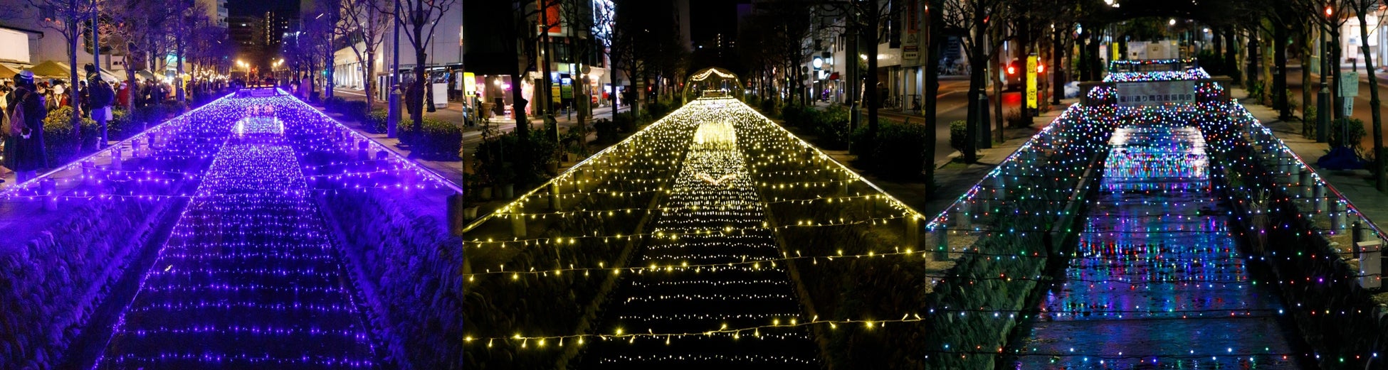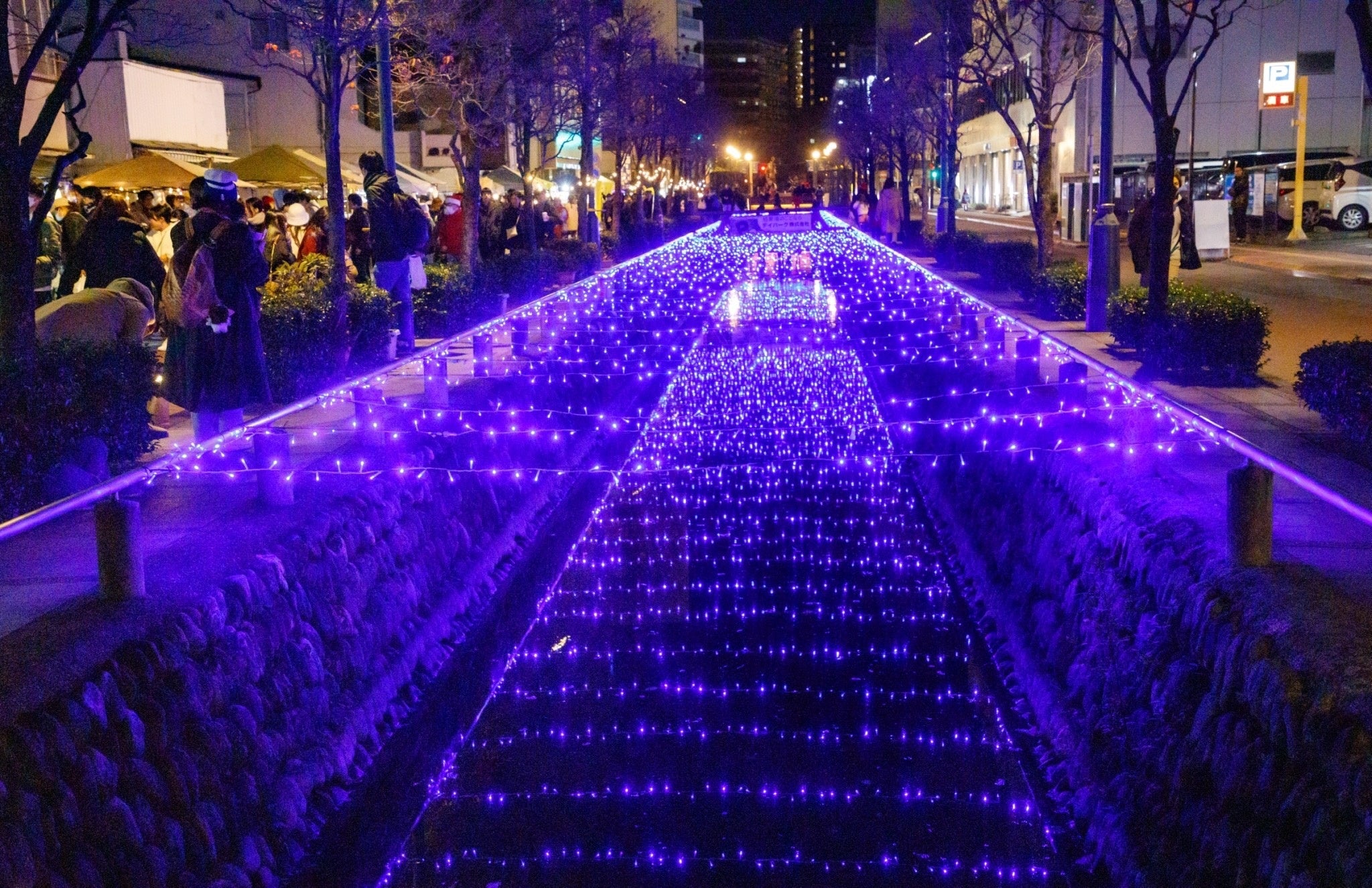 今年のイルミネーションは、星川の流れに沿ってきらめく無数の光が、まるで宝石を散りばめた帯のように川面を彩ります。 昨年の約2倍の長さの約500メートルの区間が、通る人々を幻想的な光の世界へと誘います。星川広場からオーシャンブルー区間、シャンパンゴールド区間 、見るタイミングによって色が変化するレインボー区間と歩くにつれて異なるテーマの光の世界が広がります。水面に映る光のゆらめきと、冬の澄んだ空気の中、五感で感じるイルミネーションは、訪れる人々の心を癒し、忘れられない思い出となることでしょう。