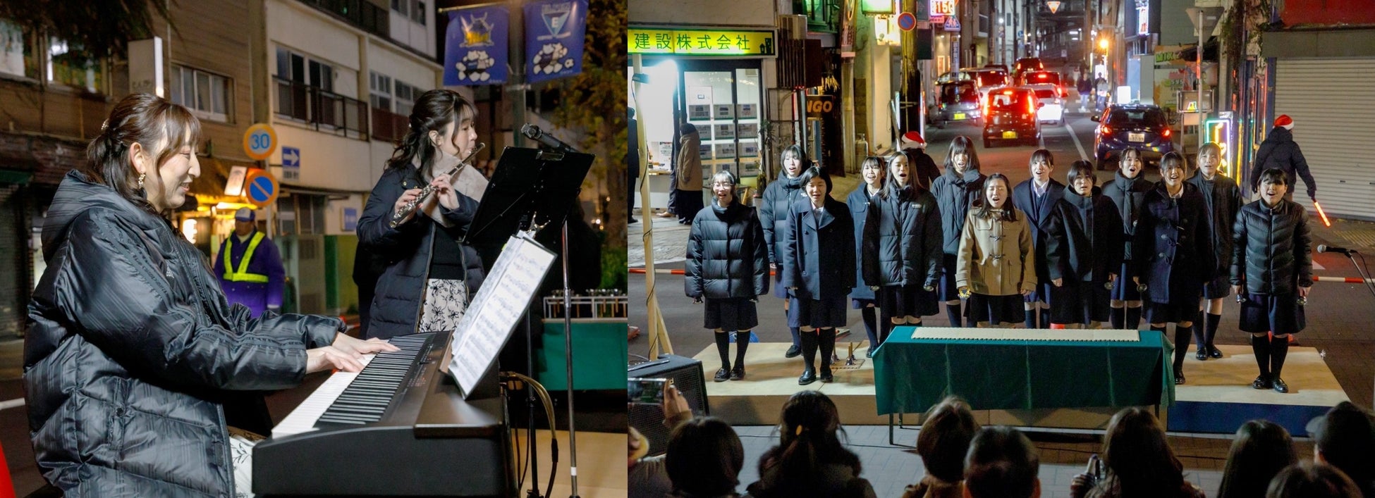 12月14日(土)の点灯式では、ピアノ・フルートデュオ「えみゆか」や埼玉県立熊谷女子高等学校音楽部によるクリスマスコンサート、そして会場一体となった合唱など、多彩な音楽イベントが開催され、冬の星川に華やかな彩りを添えました。点灯式イベントは星川夜市とともに、冬の星川に賑わいを創りました。オキナヤは、今後もこのような地域貢献活動を通じて、地域の魅力創りを続けて参ります。