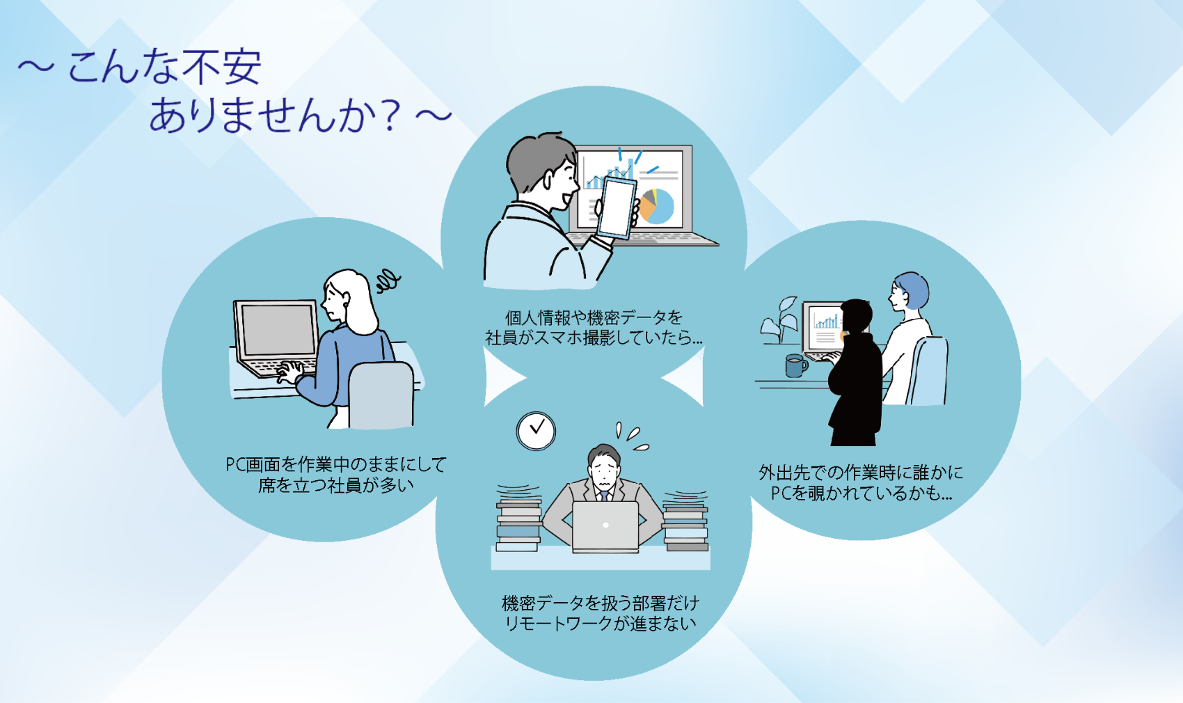 各企業にて様々なセキュリティ対策を講じていると思いますが、「画面の盗撮や覗き見による情報漏洩」の対策はおろそかにされがちです。しかしながら、ショルダーハッキングや内部不正による情報漏えいの事例も増加しており、重要な課題と考えられます。