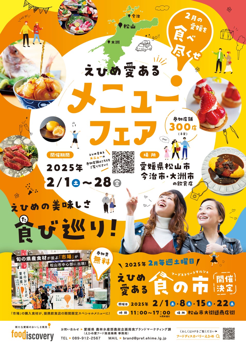 2月の1カ月間、旬の愛媛県産食材や地元ならではの逸品など、産地の魅力が体験できる飲食店フェア「えひめ愛あるメニューフェア」を同時開催。今回は松山市だけでなく、観光客からの人気も高い今治市と大洲市をエリアに加え、参加店舗数も増加するなど更に充実、グレードアップ。