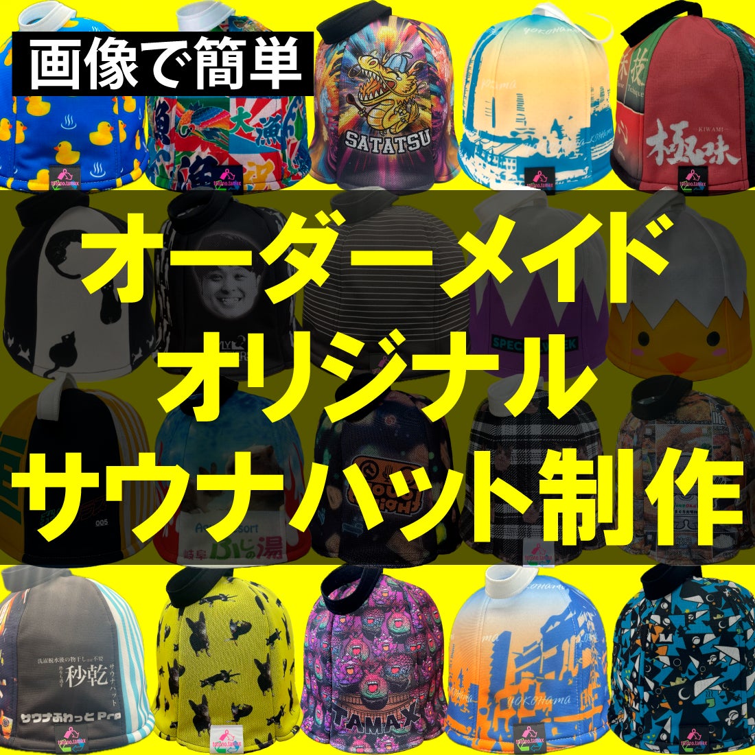 TAMAXでは、自社で製造している為、サウナハットも1枚からオリジナルプリントで制作可能です。