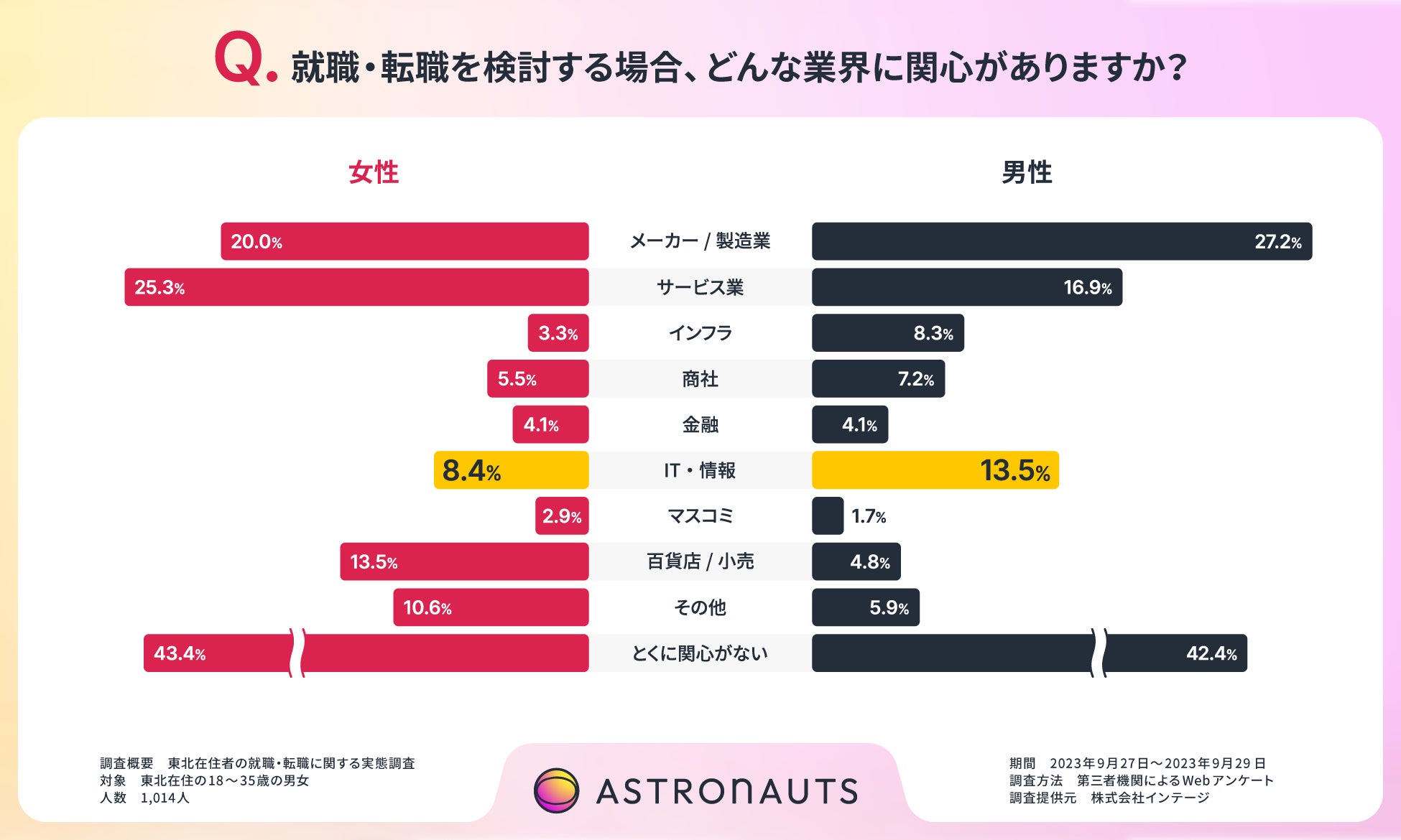 関心のある業界に関する質問では、「とくに関心がない」を除き、男女ともに「メーカー/製造業」、「サービス業」が高く、男性では次いで「IT・情報」に関心があり、女性は「百貨店/小売」「その他」の次という結果に。男女間で少し差があるものの人気度は高くない傾向が見られました。