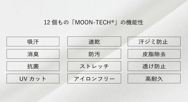 使用した素材は「MOON-TECH®︎(ムーンテック®)」。夏の不快要素を大きく抑制し、毎日を「未来の生活」に変えていく高レベルな機能性を12種類も搭載した、「過剰なほどの機能性」を持つ先端テクノロジー素材です。