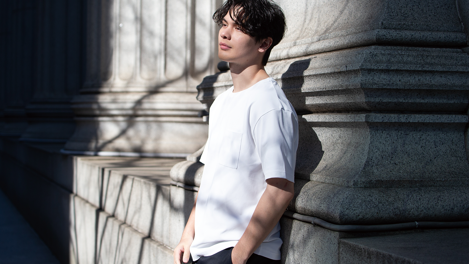 素材の持つ「過剰なほどの機能性」と、1枚でもジャケットインでも上品で美しく映えるようビジネス/ワークスタイルTシャツとして細かなディテールへのこだわりは、「Tシャツの在り方を変える」商品として結晶しています。