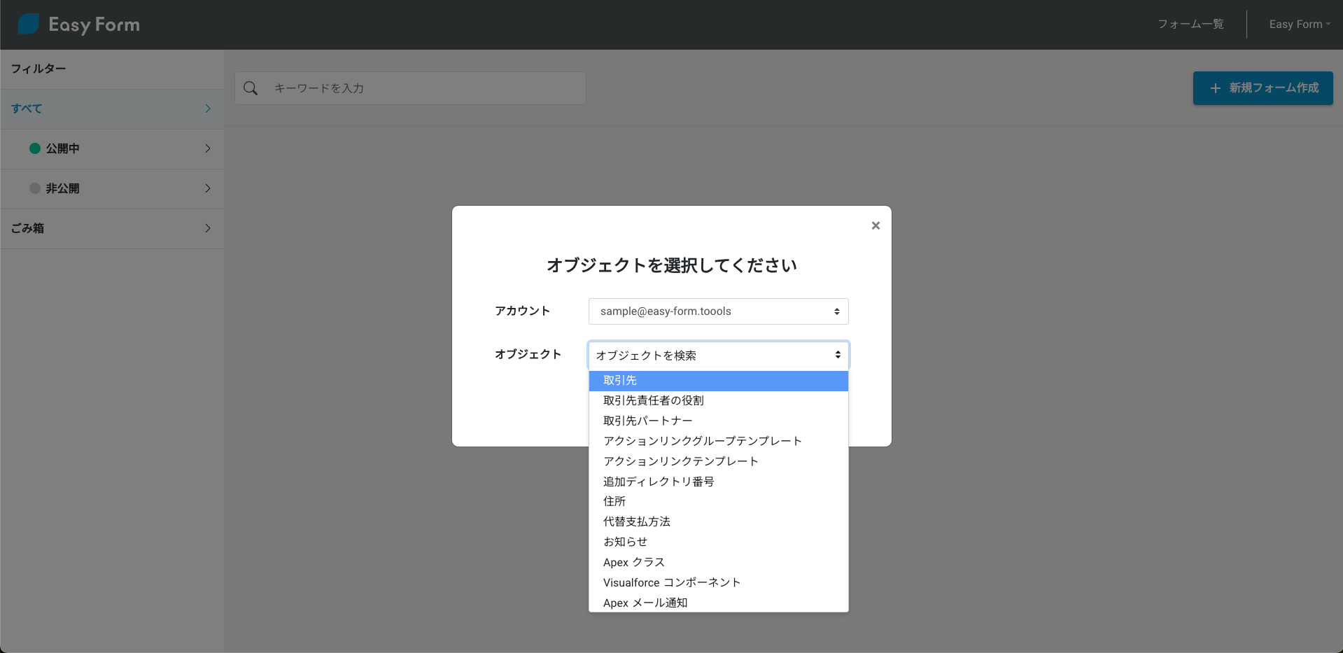 ●フォーム作成はSalesforceのアカウントとオブジェクトを選ぶだけ