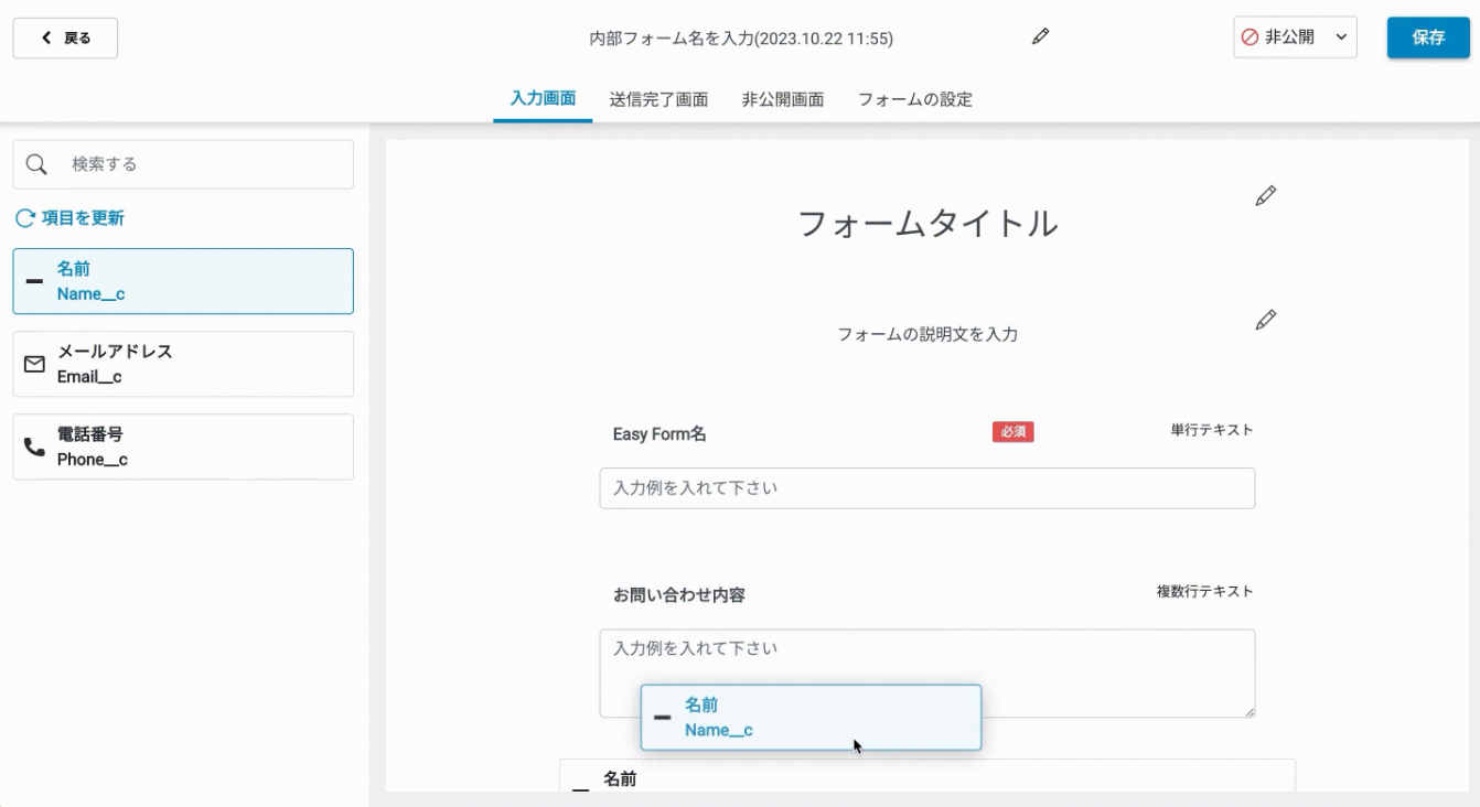 ドラッグ&ドロップで項目追加やフォームの位置移動を行うことができます。必須項目の設定やデフォルト値の設定、入力例の設定など柔軟にフォームの内容を編集することができます。