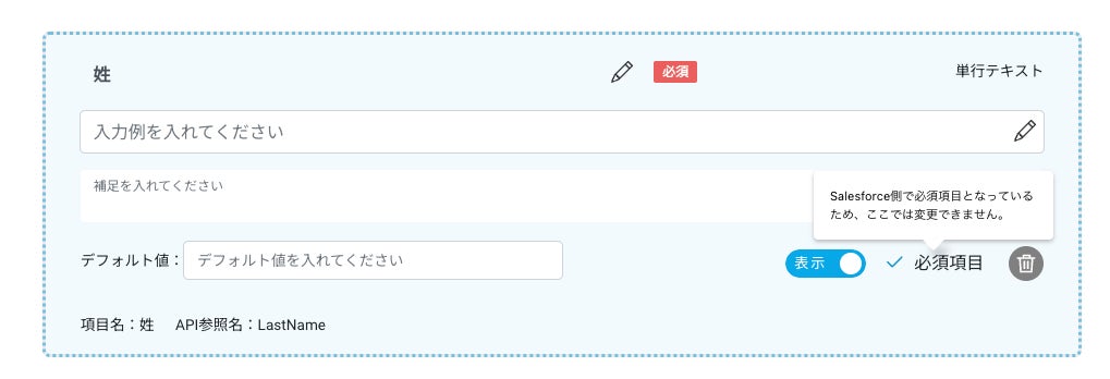 Salesforce上で必須登録となっている入力項目は、フォームに自動で追加されます。この機能により、フォーム作成者の作業時間を短縮できることに加え、必須項目の設定漏れでSalesforceと連携できないといった事象を防ぐことができます。