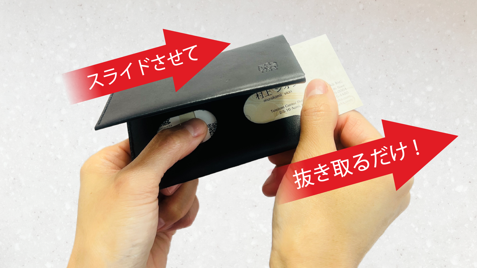 Slide Thumb®︎(スライドサム)は、蓋を開けずに親指(thumb)をスライドさせるだけで名刺を取り出せる名刺入れです。(意匠登録 第1722554号)