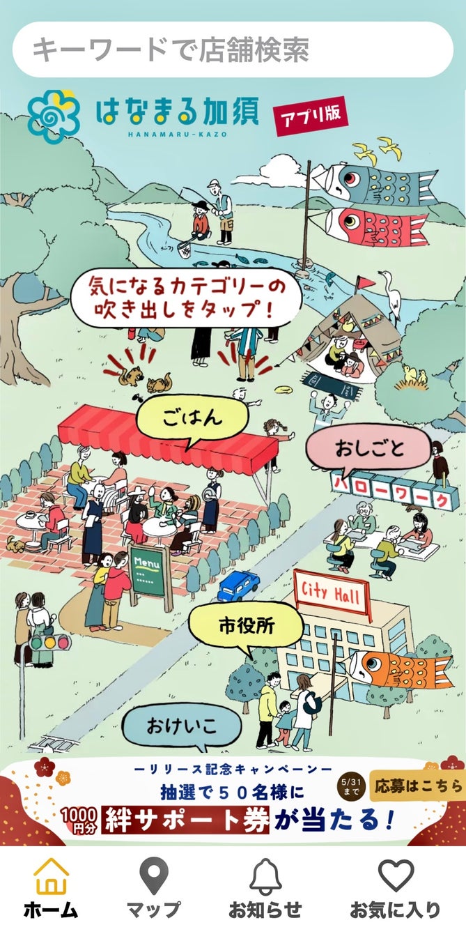 地域のバーチャルタウン「はなまる加須」に「加須市役所」が誕生しました。アプリ版では、スマホからすぐに地域の話題にアクセス!プッシュ通知で地域情報を素早くキャッチ!マップ機能で地元の名店を検索可能に!
