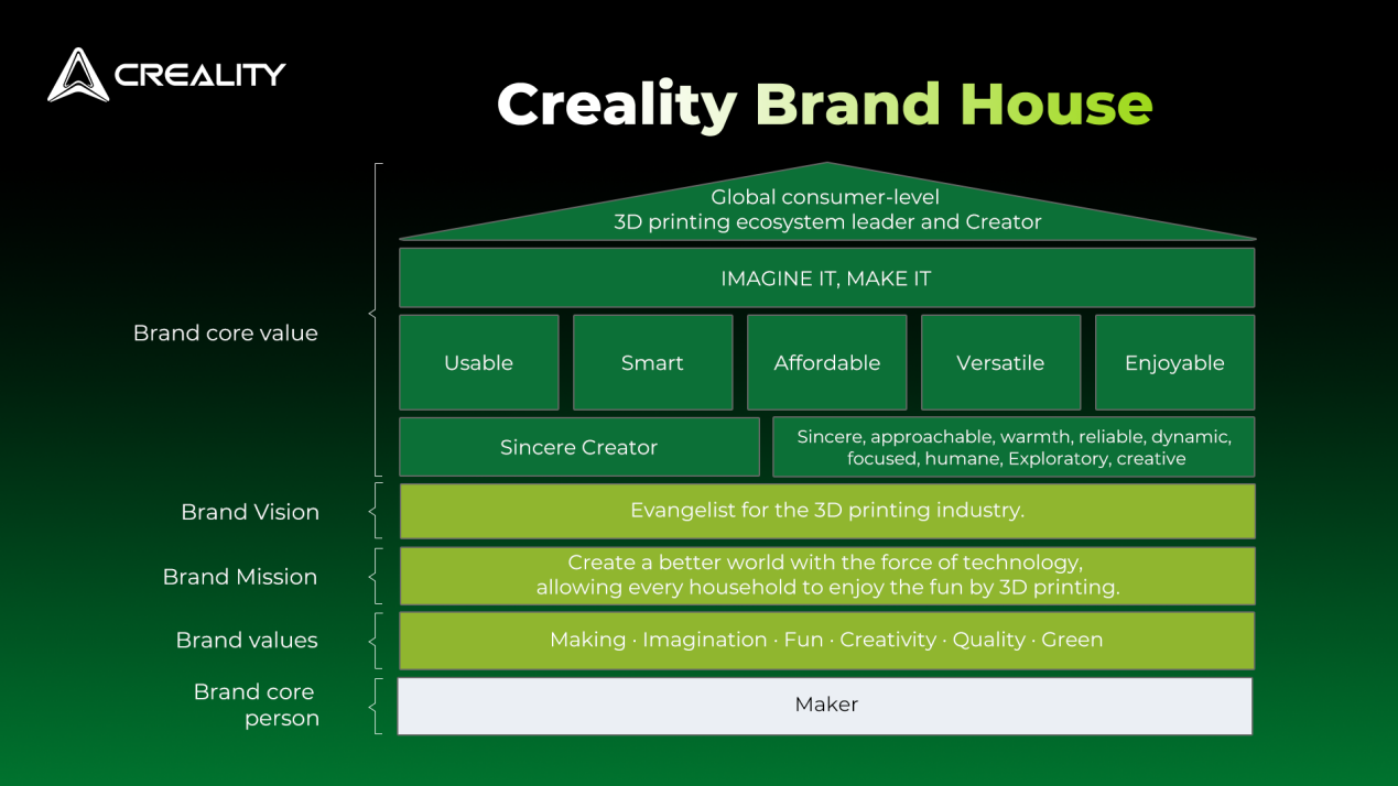 この10周年記念イベントは、新しい年を迎えるにあたり、最近のブランド刷新を振り返る機会となりました。この革新的な取り組みのおかげで、Creality は新しいロゴを発表しました。緑色の「A」は、組み合わされた手のような形で、持続可能性、熟練、コミュニティを象徴しています。今回のブランド刷新は、「USAVE」というブランドエッセンスに集約されるコアバリューを中心に展開されました。これは、「Usable(使いやすい)」「Smart(スマート)」「Affordable(手頃な価格)」「Versatile(多用途)」「Enjoyable(楽しい)」というそれぞれが特徴的なコミットメントを具現化しています。Crealityは、新しいスローガン「Imagine It, Make It」を掲げ、ユーザーの創造性を解き放つことを奨励しています。
