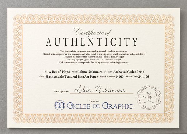 追加サービスとして「証明書の発行」をご利用いただけます。証明書にはロゴが刻印されており、作者様のサインをご記入可能な欄を設けております。当社のジークレープリント技法で印刷された作品であることを証明するものであり、アーティストご本人が監修した美術作品であることを表します。