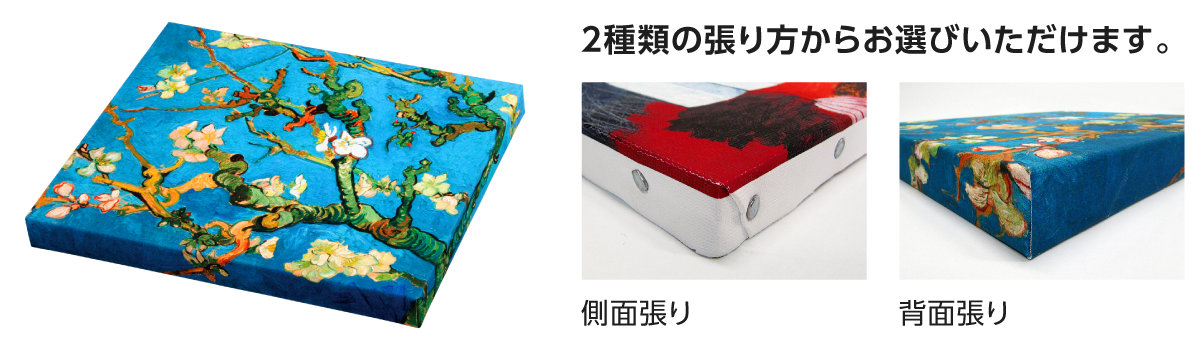キャンバスを木枠に張り付ける伝統的なマウント加工。「背面張り」は側面まで印刷が可能なため、現代アートにおいて人気の高い作品展示形態です。