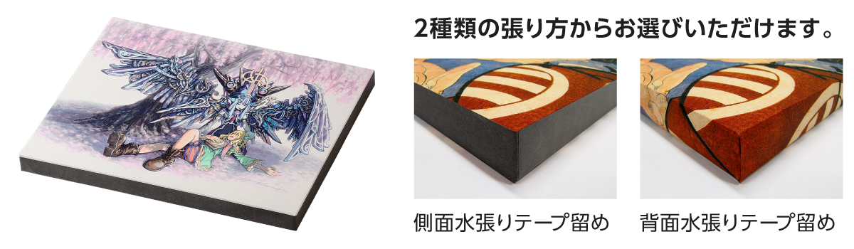 ●ジークレープリント+木製パネル水張り加工(側面水張りテープ留め・背面水張りテープ留め)