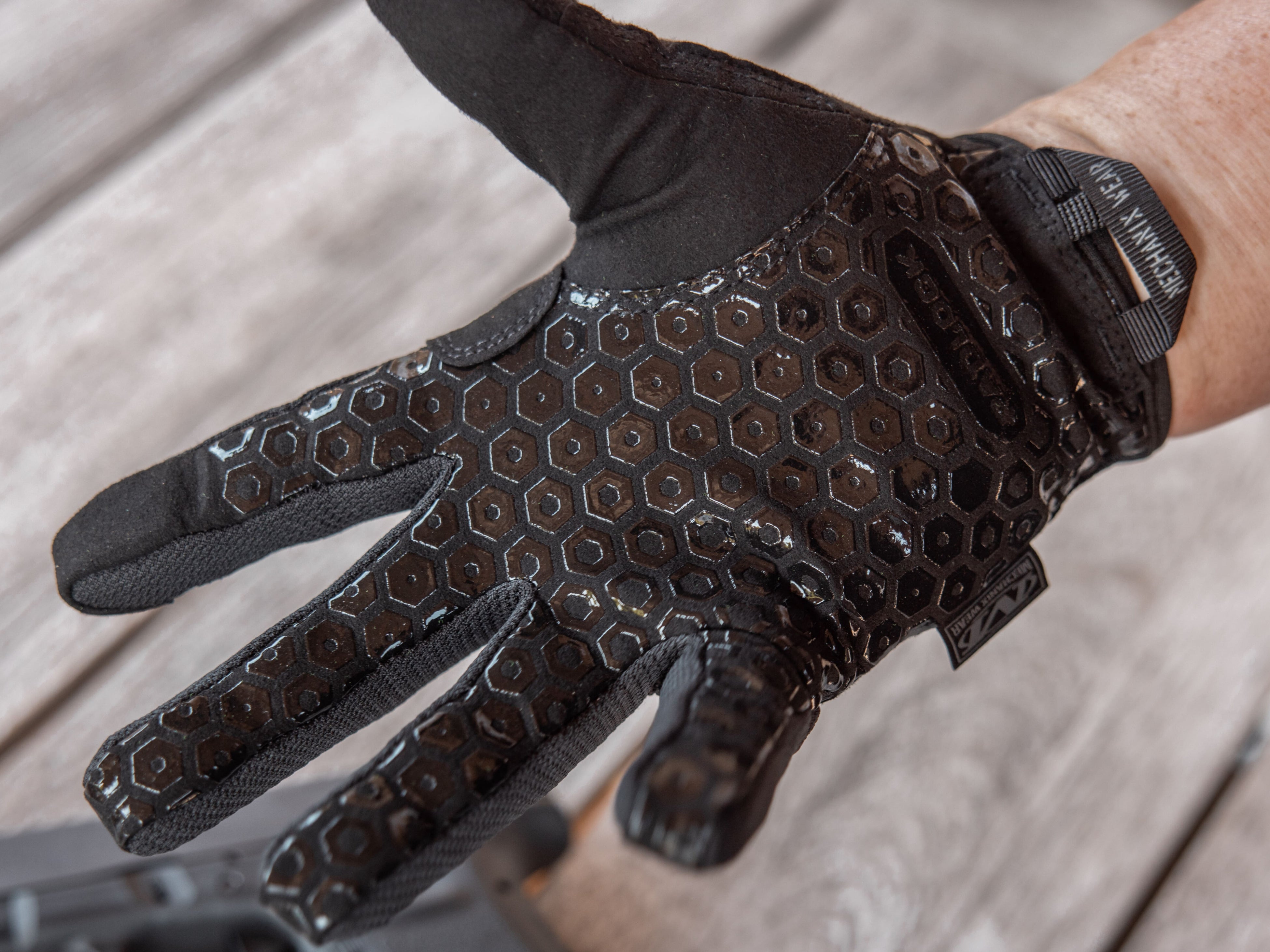 親指の裏に配置された汗拭き素材と手の平に採用されたタッチスクリーン対応の合成レザーにより、一日中グローブを外さずに快適に使用できます。