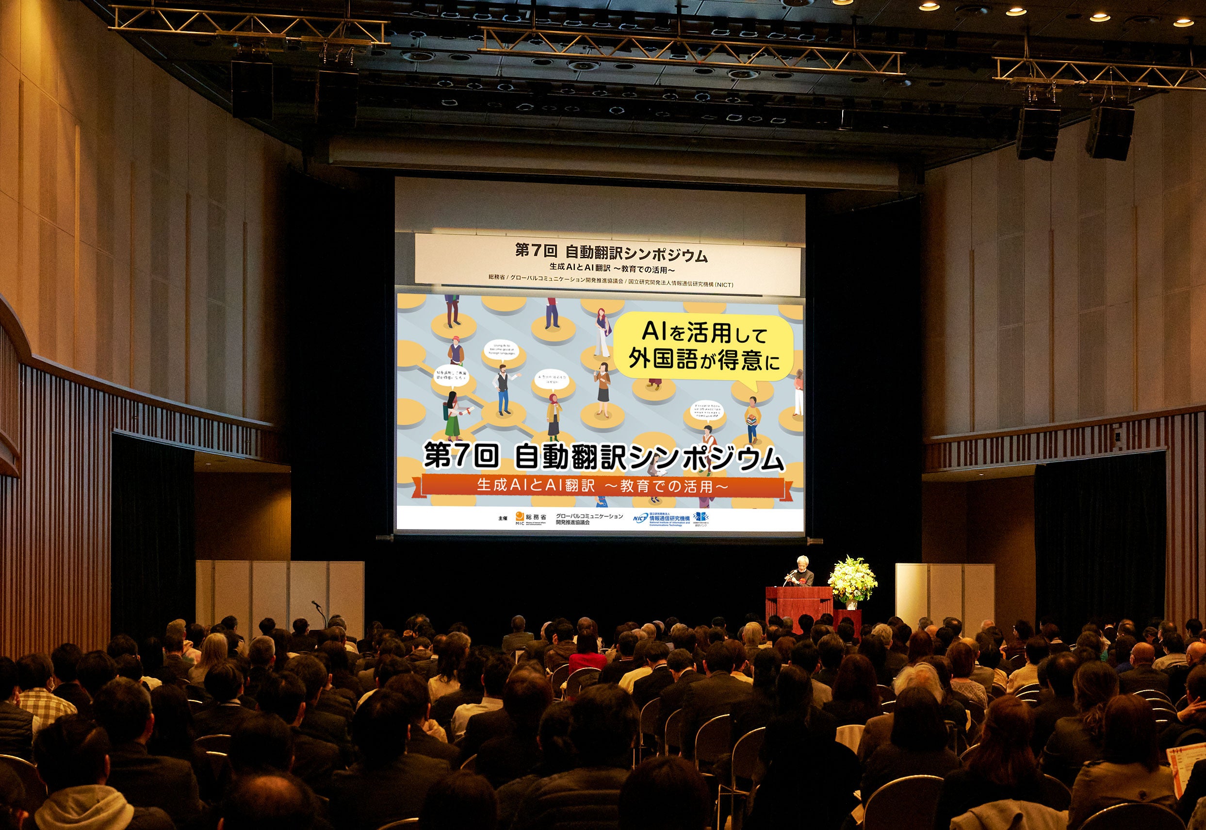 2024年2月22日(木)、総務省、国立研究開発法人情報通信研究機構(NICT)及びグローバルコミュニケーション開発推進協議会は、「生成AIとAI翻訳 ~教育での活用~」をテーマに、今回7回目となる「自動翻訳シンポジウム」を品川インターシティホールにて開催しました。当日は445名が参加し、研究者による最新の技術動向や、教育者による教育現場での自動翻訳技術の活用に関する講演や、23者の企業・団体による最新の自動翻訳製品・サービス等の展示を行いました。