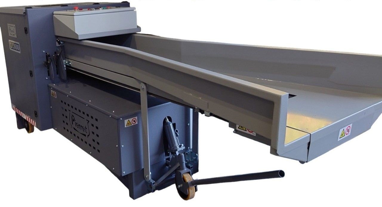 ベルトコンベアで繊維質の材料を自動で刃の方向にフィードします。この段階ではまだ繊維はフワフワのままコンベアの上を搬送されていきます。幅は450~600mmの幅となります。ベルトコンベアの下部も簡単に清掃できるようにデザインされています。