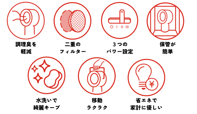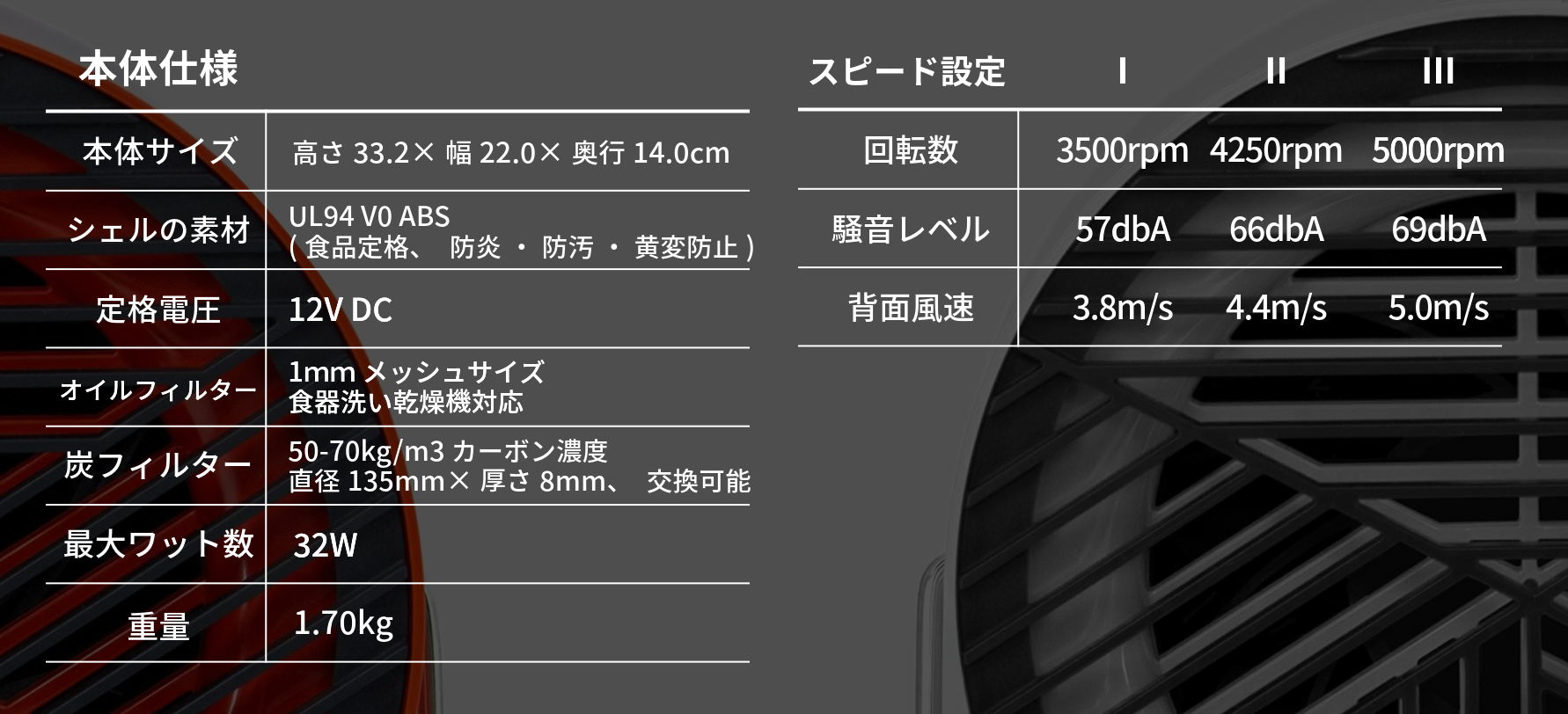 強力なファンで調理中の煙を吸い込み、本体内部とファンを通過させる前に、2つのフィルターを通して背面から空気を排出します。この構造により、ファンを汚れから守り、製品寿命を大幅に向上させることに成功しました。