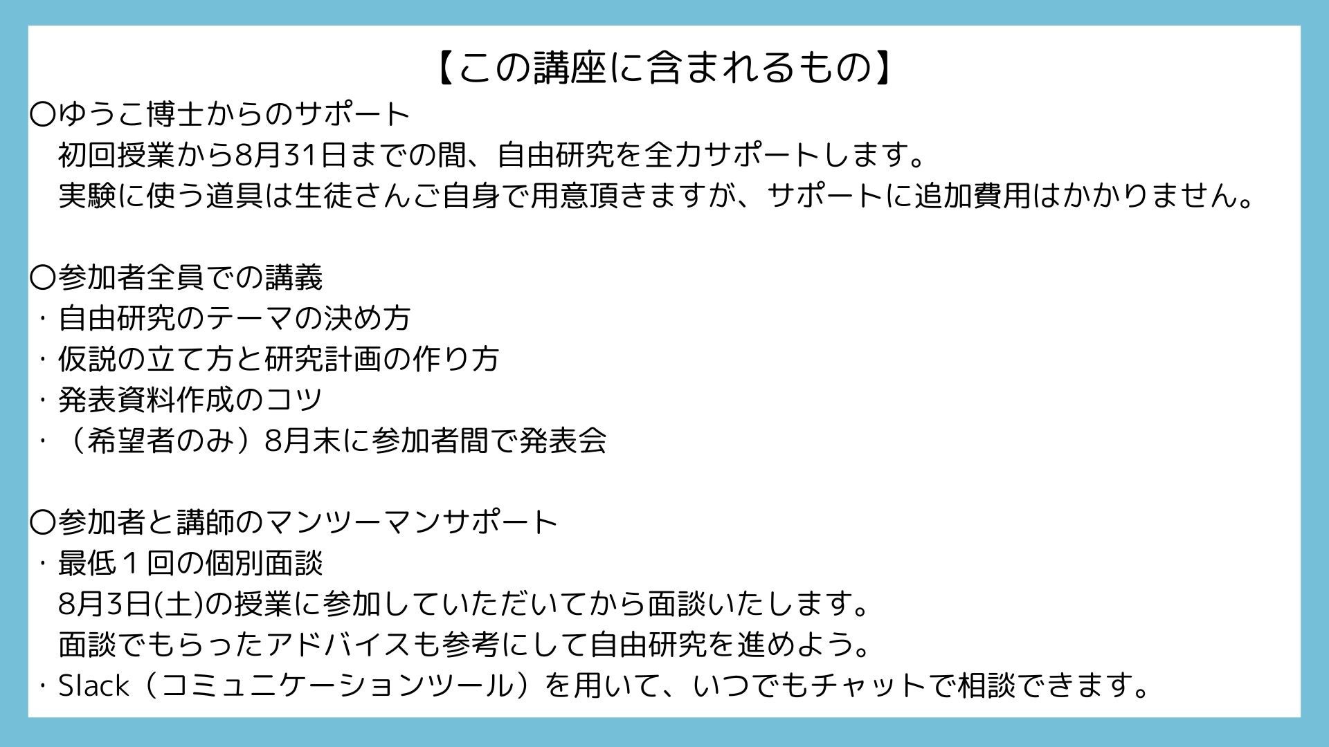 日々研究にワクワク挑戦している研究者から直接、研究をどのように面白く進められるか、包み隠さず全てをお伝えします。その上で、お子さま本人の疑問を掘り起こし、研究し、その結果を伝えるためのレポートを作るところまでをサポートいたします。また、希望者を募って、参加者間での発表会も行います。