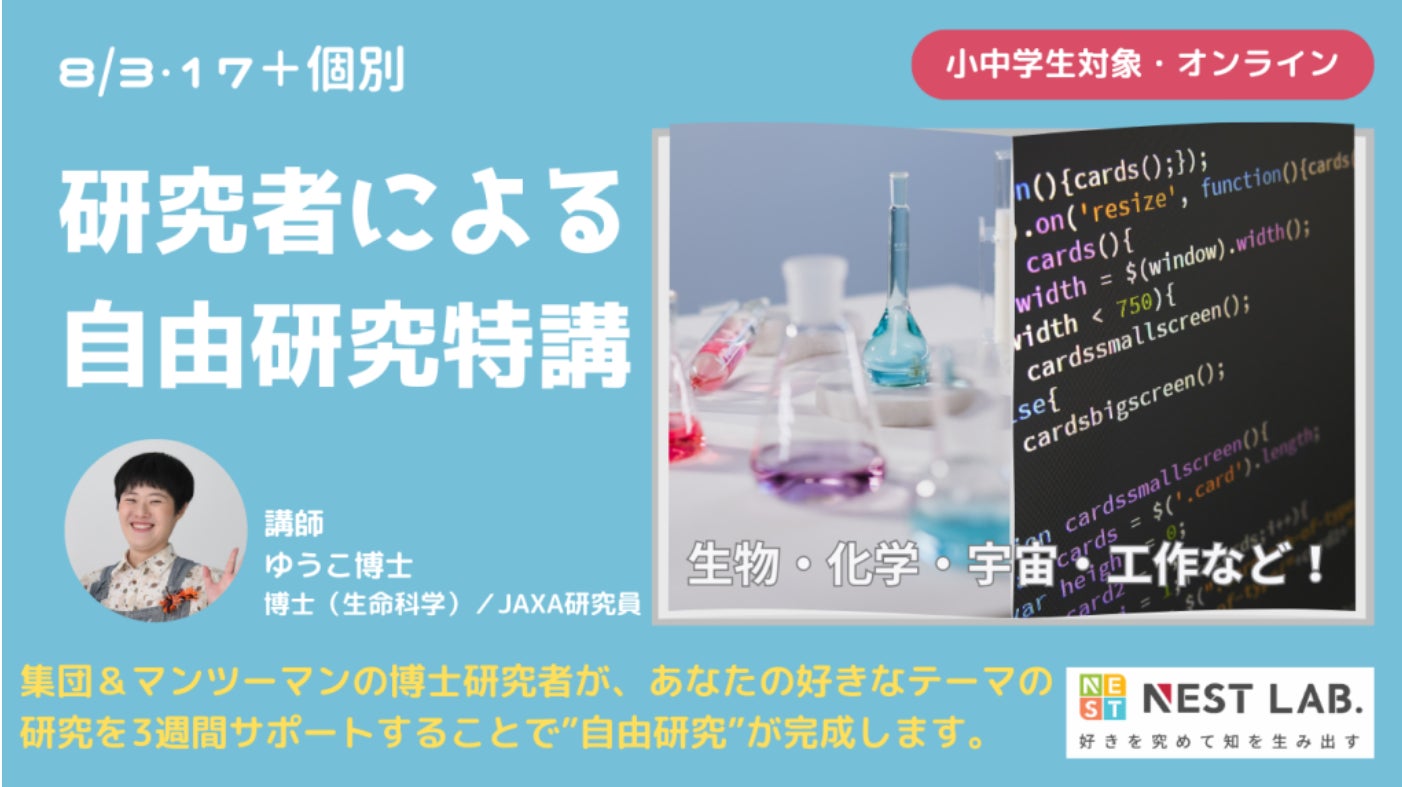 【全国から参加可能】夏休みの自由研究を、博士が1か月サポート! NESTLAB.の「研究者による自由研究特講」(申し込み期限:8月2日(金) 正午)
