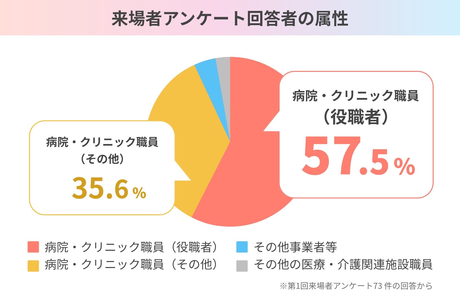 医療機関へのアプローチにおいて決裁権者にアピールすることは難しい点の1つですが、第1回来場者アンケートでは半数以上が役職者の回答という結果になりました。