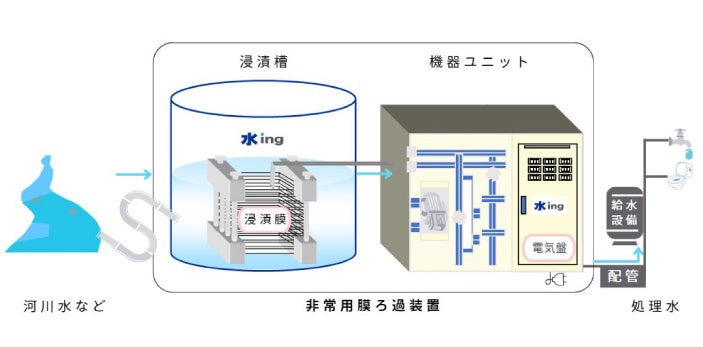 当社グループが開発した非常用膜ろ過装置は、近くの水源から生活用水を造ることが可能な装置です。汲み上げた水を、浸漬槽内の膜でろ過して、機器ユニット内のポンプで学校の給水設備に送ります。膜ろ過を採用しているため、確実な固液分離が可能であるほか、浸漬式のため高濁度原水※が流入した場合にも安定した運転が可能です。水質の変動が激しい水源においても、安定して処理能力を発揮し、安全な生活用水を供給します。