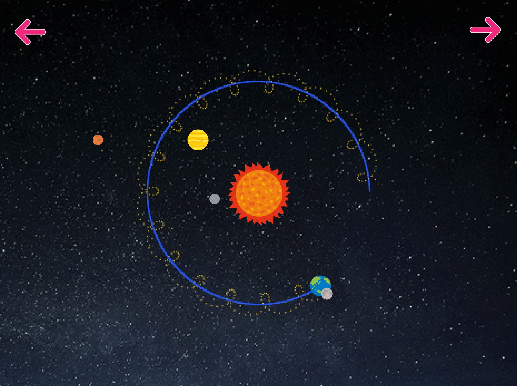 例えば、太陽系の不思議を学びながら、惑星の公転シミュレーションをプログラミングで実装する天文学コース、図形や関数の特徴を理解し、それらを用いて綺麗な模様をプログラミングで描画する数学アートのコースなどがあります。