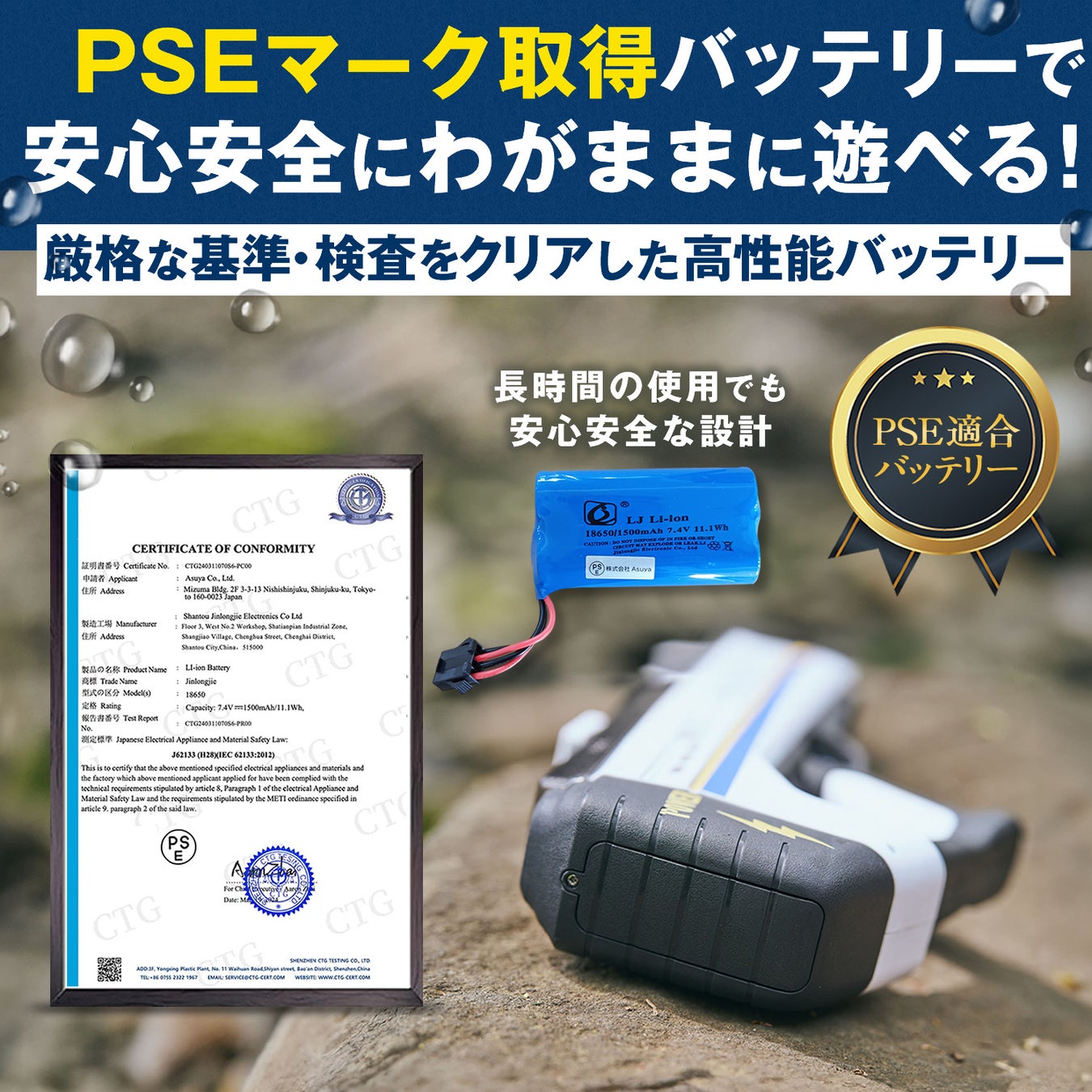 ・安心のPSE認証バッテリー: 高品質なPSE認証バッテリーを使用しており、安全性を確保しています。長時間の使用でも安心してお使いいただけます。