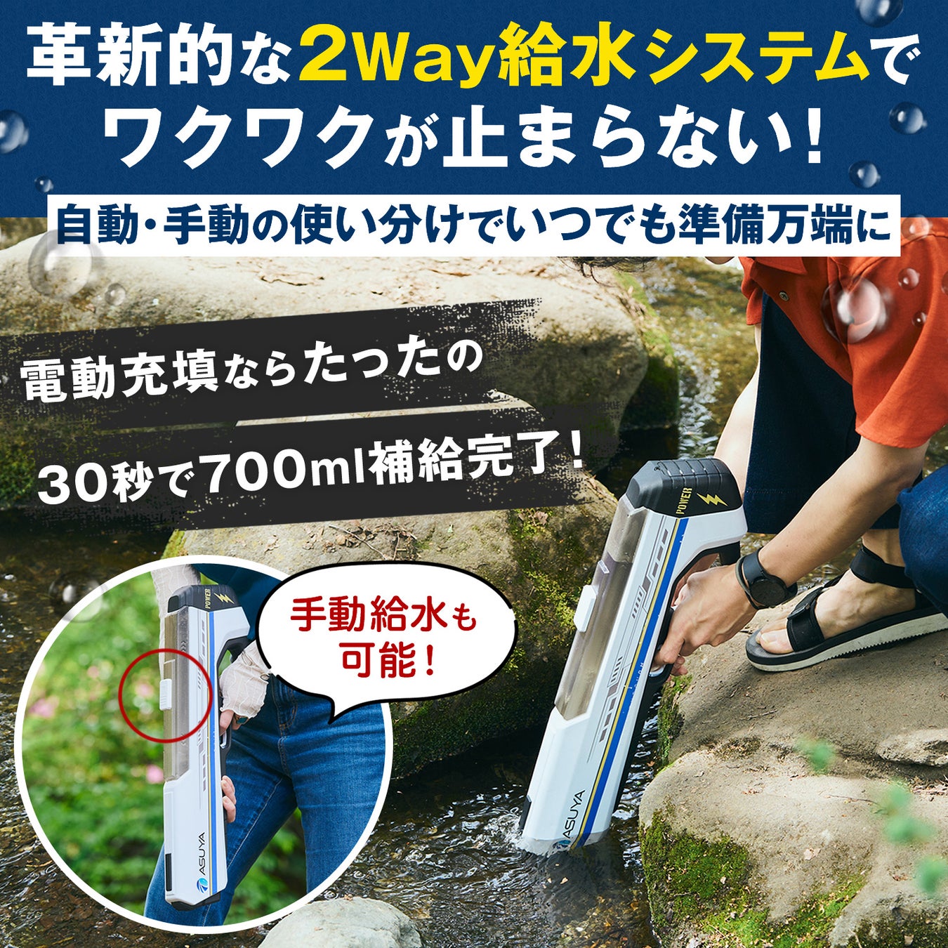 ・2WAY給水システム: 電動と手動の2つの給水方法を搭載しており、どんな環境でもスムーズに水を補充することができます。電動充填ではわずか30秒で満タンになります。