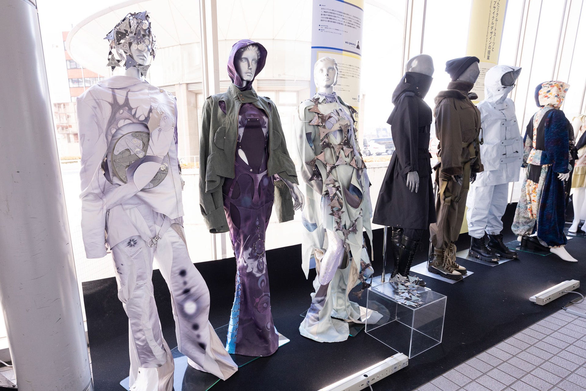 ファッションテクノロジーコースでは、テクノロジーを活用したデザインを商品化へと発展させることをテーマに、調査・試作・検証を経て作品を完成させ、ポートフォリオとしてまとめます。その研究成果と、企業との産学連携による共同研究作品を展示します。