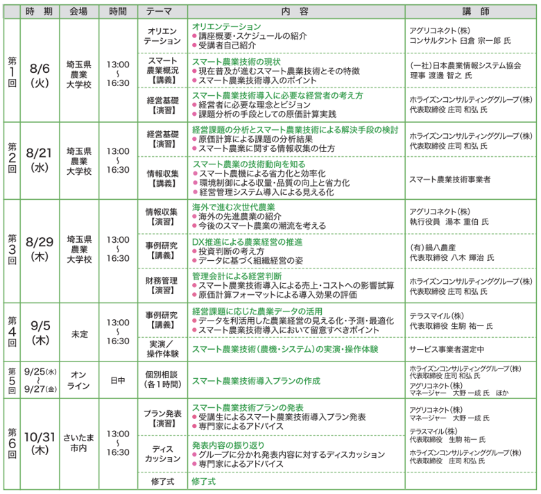 講義: 8月6日(火)、21日(水)、29日(木)(埼玉県農業大学校(熊谷市樋春2010))