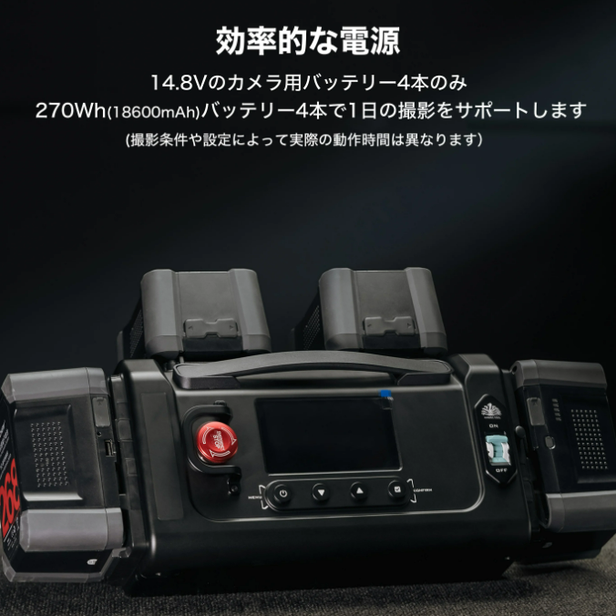 270Wh (18600mAh) バッテリー4個で、24時間の撮影が可能です。