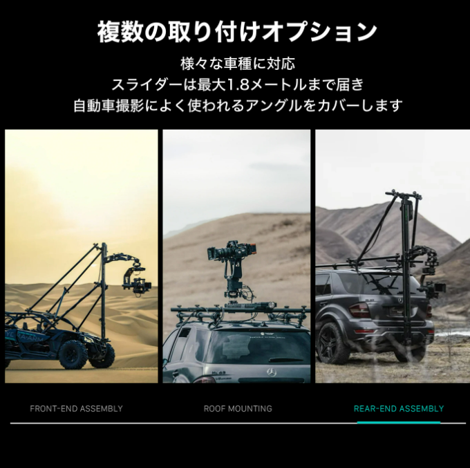 カメラを移動するときは、無線もしくは有線でカメラスライダーを電動制御し、車内から遠隔操作して撮影することができます。