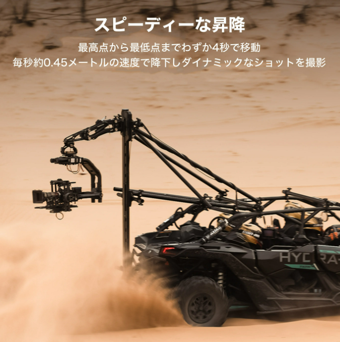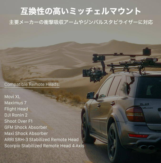 カメラアームにオプションで、最先端の自動車技術から考案したオートダンピング機能を追加することができます。自動的に振動を軽減してくれるので、よりスムーズな動画撮影が可能になります。