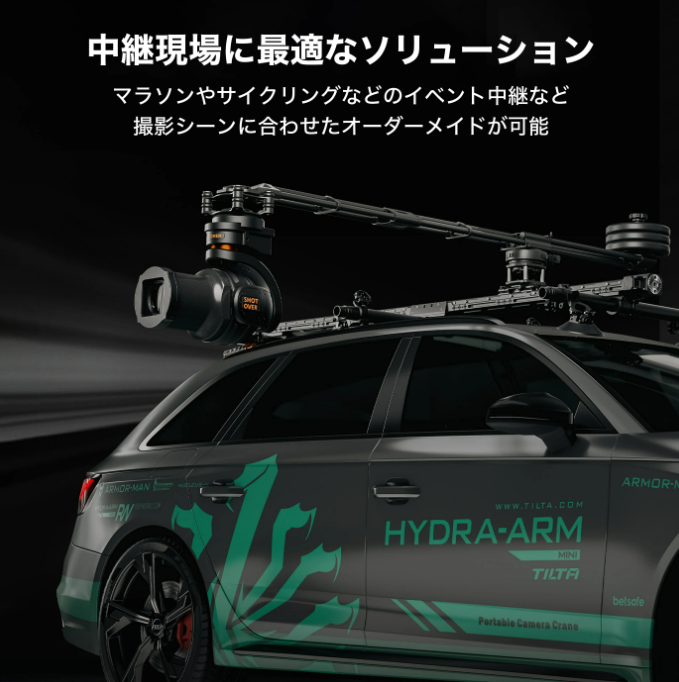 TILTAのHydra Arm Motorized Slider Systemは、車に取り付けてカメラを固定し、テレビ中継や生放送など、さまざまな撮影シーンで活躍するカーマウンティングシリーズの最新製品です。衝撃吸収アームによって、カメラのスライド移動や車の移動による振動を打ち消し、スムーズな映像を撮影することができます。また、Flight Head、Shoot Over F1などの主要ブランドのカメラアームやスタビライザーにも対応しているので、さまざまな機材での撮影を可能にしてくれます。