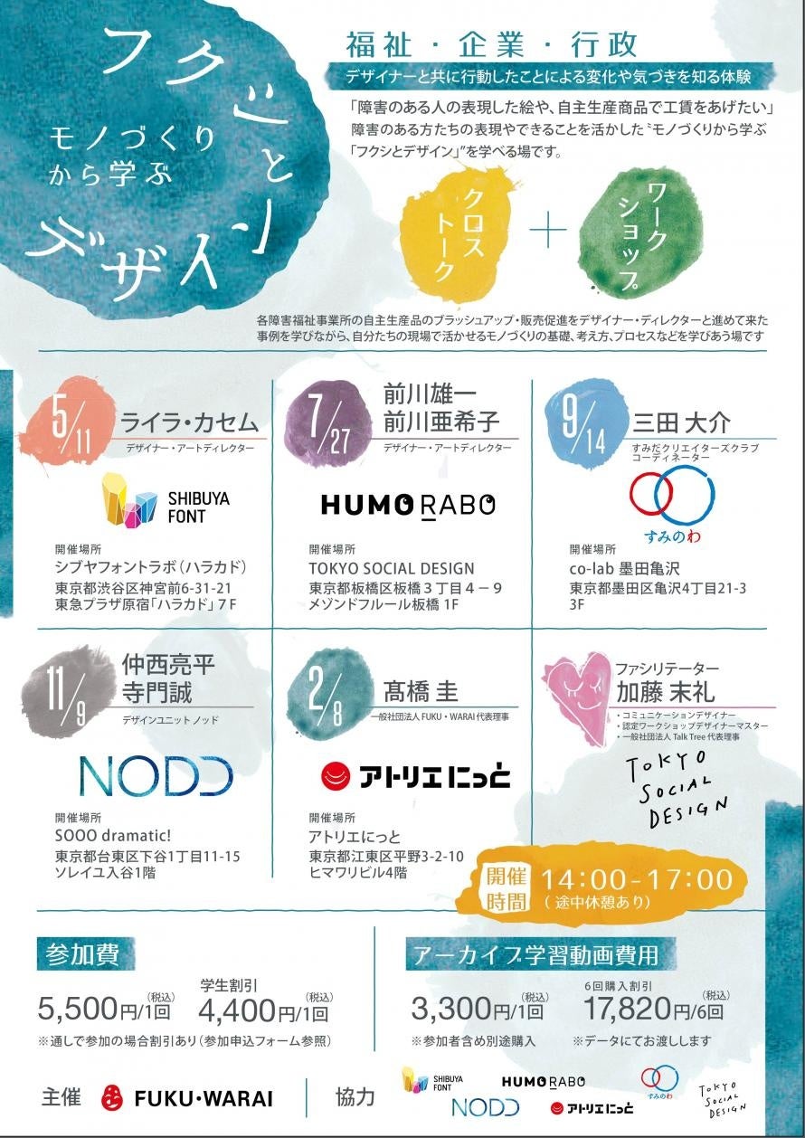 「障害のある人の表現したイラストなどを活かした商品づくりに挑戦したい、またはブラッシュアップ したい!」 「今までずっとやり続けてきた創作や自主生産活動でできたものを商品にして工賃をあげたい!」 など、福社事業所などで、商品づくりに取り組み、悩んでいる福祉職員の方や、そのような場でデザインの仕事に関わりたいと思っているけれど、どこにアクセスしたらいいのかわからないと悩まれているデザイナーの方に向け、皆さんの課題を解決し、想いを繋ぎそれぞれの現場で活かせる学びを、福祉の現場で働く方とデザインの仕事に携わる方たちと一緒に、障害のある方たちの表現やできることを活かした〝モノづくりから学ぶ 『フクシとデザイン』”を学べる場を立ち上げました。