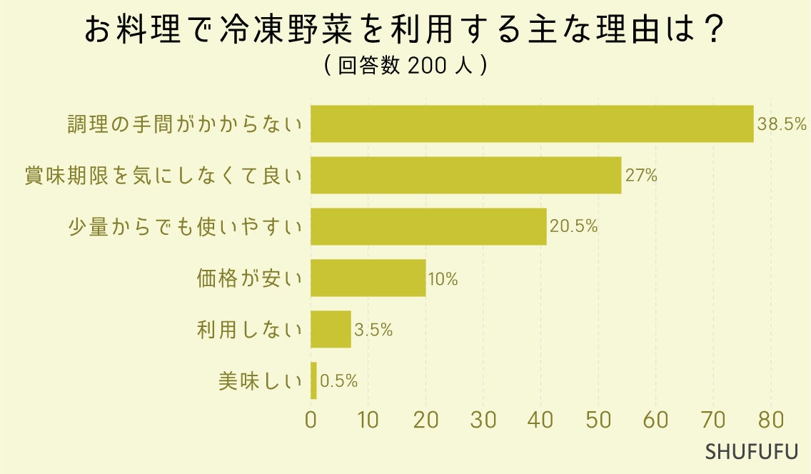 「お料理で冷凍野菜を利用する主な理由は?」との問いに対して最も多かった回答は「料理の手間がかからない(38.5%)」でした。