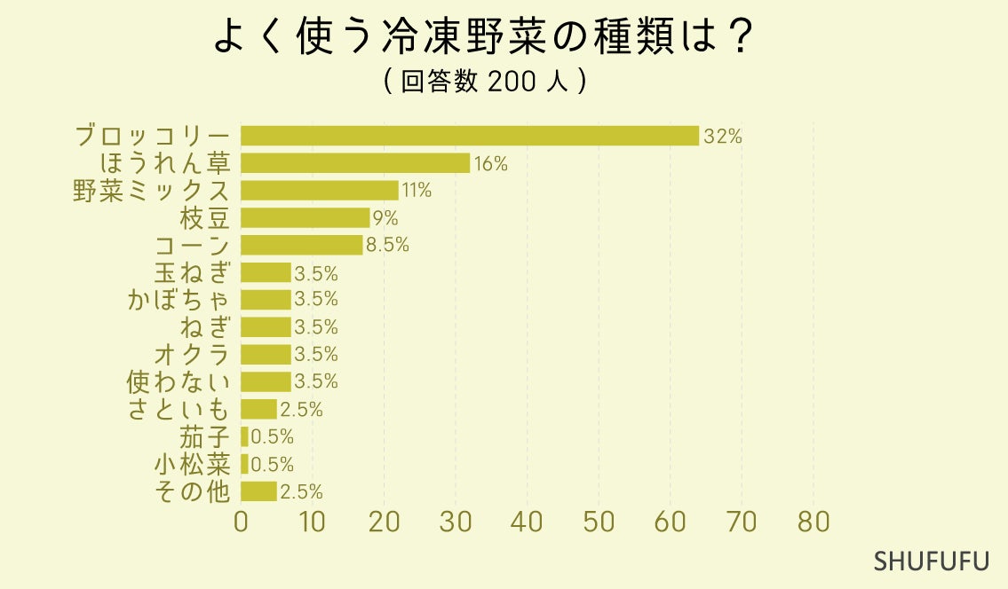 200人に冷凍野菜の利用に関するアンケート調査を行った所、最もよく利用する冷凍野菜では「ブロッコリー」「ほうれん草」「野菜ミックス」といった順となっていました。