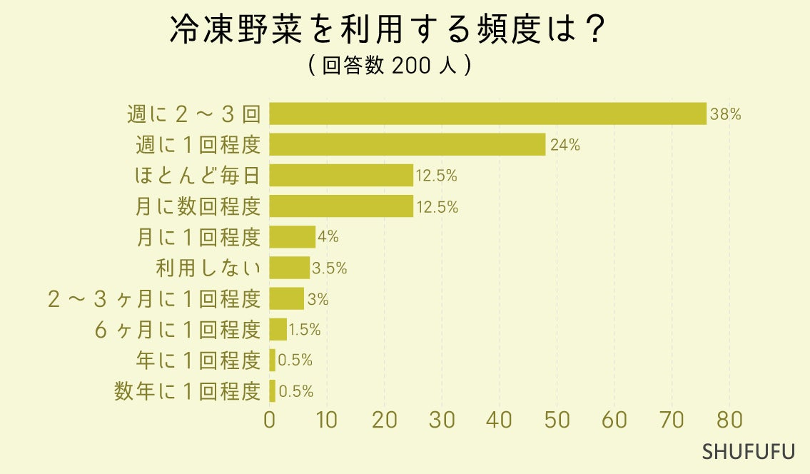 冷凍野菜を利用する頻度は「週に2~3回」と選択した人は全体の38%と最も多かったです。