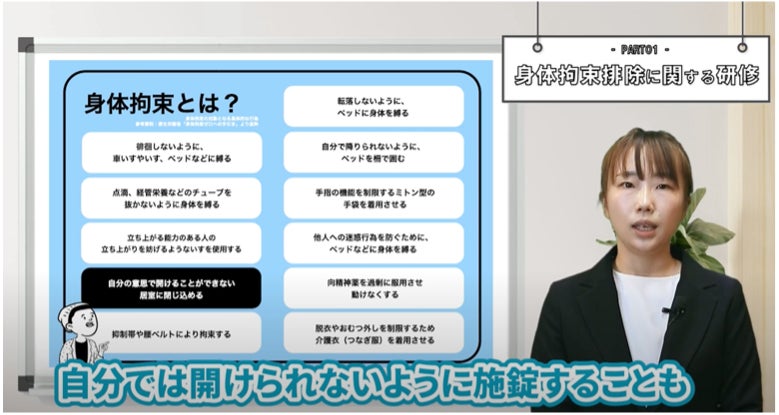 認知症ケア、身体拘束、接遇、プライバシー保護など、法定研修に関わる分野を全て網羅していきます。