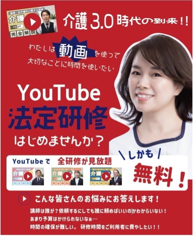 一般社団法人全国介護支援協会では、これまで介護職員のためのおすすめ研修案内を毎月発刊しておりましたが、「もっと介護のことを学び自分を高めたい」という介護職員の要望、「介護職員の教育が難しい」と悩む介護事業所からの声に応えるため、令和6年6月より「動画で学ぼう!法定研修」をYouTubeにて無料配信しています。