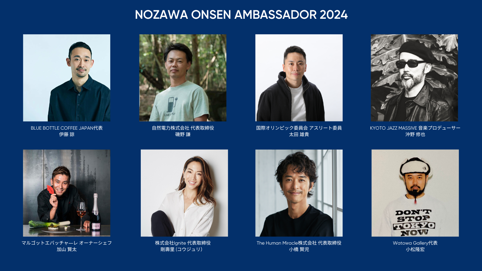 初代の野沢温泉アンバサダーは、既に野沢温泉村に幾度となく訪れたことがあり、野沢温泉ファンである、スポーツ、食、アート、音楽など多方面で活躍をする著名人8名を任命いたします。
