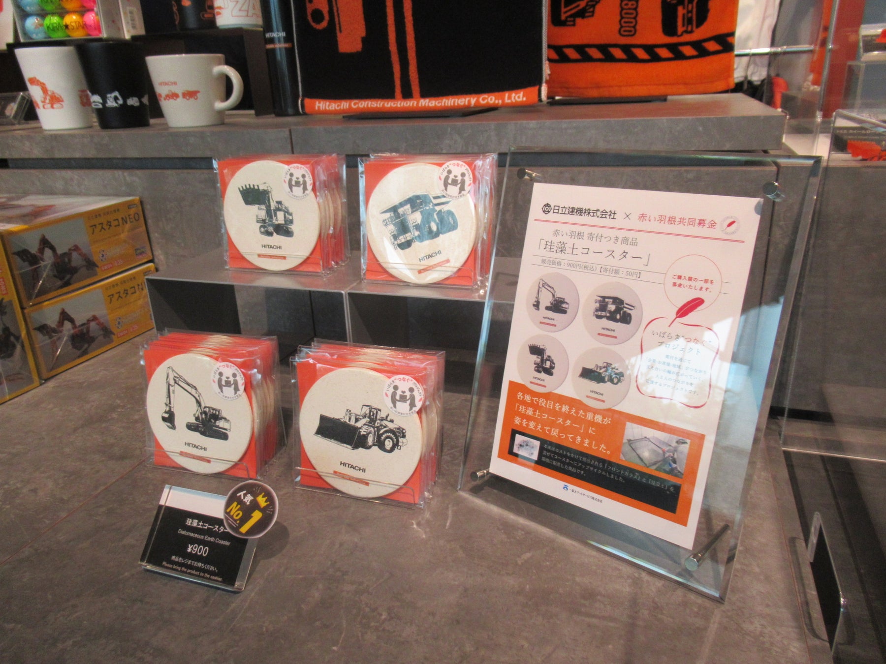 日立建機株式会社 土浦工場「Orange Innovation Plaza」内の売店にて販売されているアップサイクル商品「珪藻土コースター(寄付付き商品募金)」について、当社では販売協力をさせていただいております。