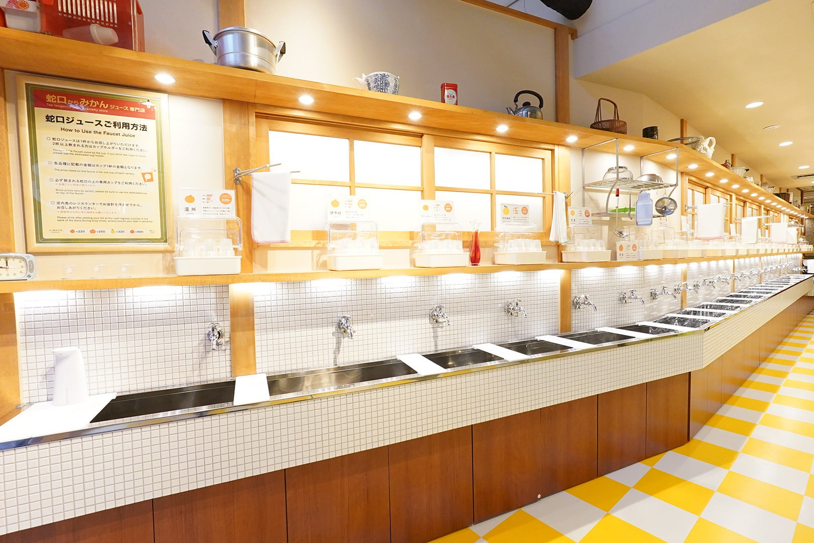 また、みかんビールを楽しんで頂くために、「おとうさんの湯上がり生ビール」もご用意しております。300mlのデキャンタ(税込400円)での提供となりますので、それぞれが選ばれた蛇口みかんジュースに、お好きなタイミングでビールを注ぎ、オリジナルみかんビールをお楽しみください。