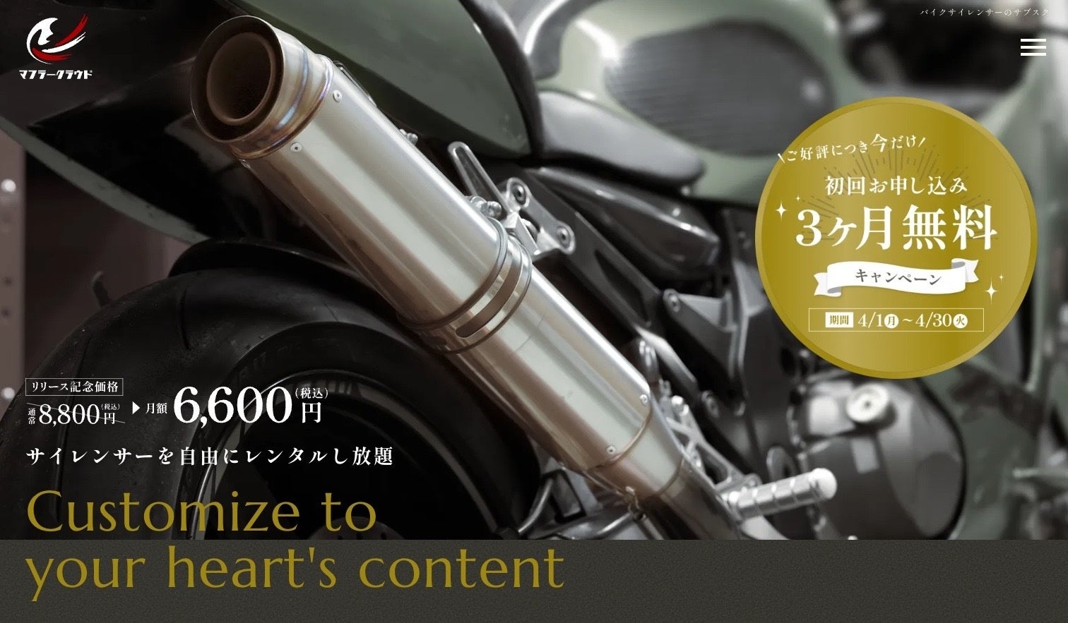 ・月額8,800円(税込)で、バイクカスタムの王道「サイレンサー」を 気軽にレンタル