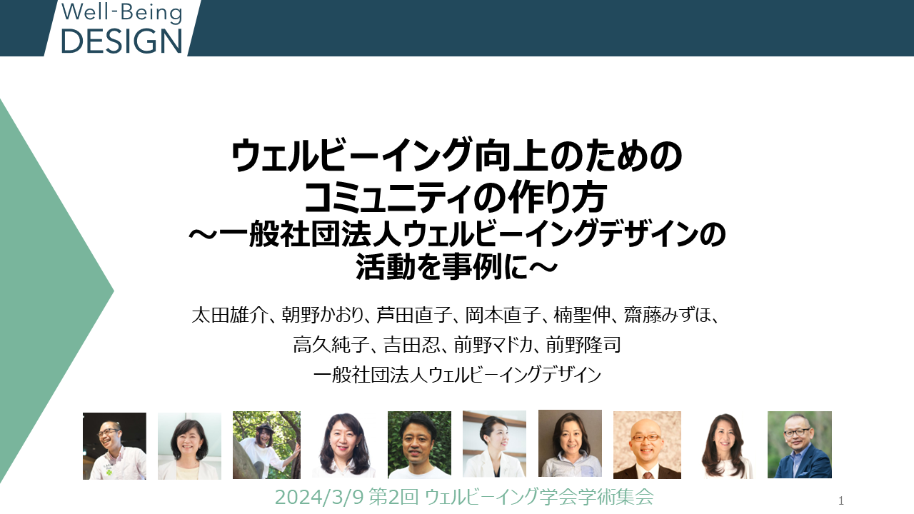 2018年2月に設立された「一般社団法人ウェルビーイングデザイン」(代表理事:前野隆司)は、今年、設立6周年を迎えました。同法人は、世の中のウェルビーイングへの関心の高まりを牽引するかのごとく、この6年間で活動の幅を広げてまいりました。そして、6周年を機に、2024年3月10日(日)に開催されたウェルビーイング学会(https://society-of-wellbeing.jp/)にて、「ウェルビーイング向上のためのコミュニティの作り方」と題した研究発表を行いました。